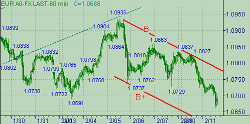 U на рис. 1 и 2. Можно считать законченным тренд 0.9857(2/12/02)-1.0935(5/02/03). Сегодня рынок пытается тестировать уровень 23.6% коррекции (равен 1.9680) от этого тренда. Первый примечательный уровень поддержки, равный сегодняшнему минимуму 1.0665, связан с равенством длин нисходящих веток в канале B-B+: первая ветка 1.0935(5/02/03)-1.0737(5/02/03) длиной 198п.; если считать за начало второй ветки цену 1.0863(7/02/03), то вариант равенства длин нисходящих веток находится на уровне 1.0665. Следующий важный уровень поддержки является 1.0630, который получается несколькими расчетными способами при рассмотрении движения в канале B-B+. Важный уровень сопротивления связан с линией B на рис. 3. Текущее положение линии B соответствует значению цены 1.0787. Следующий уровень сопротивления связан уже с линией U (текущее положение − 1.0800).Торговые тактики. Открывать сейчас позиции на продажу "мешают" технические индикаторы, которые или уже находятся (например, на часовом графике) или приближаются (например, на графике с периодом 480мин.) к области перепроданности. Поэтому можем рассмотреть следующий план: на локальном откате в область 1.0680-1.0670 открывать краткосрочные покупки, стоп-лосс 1.0650, цель 1.0730. Из области 1.0730 рассматривать (например, при подтверждении сигналами компьютерного анализа) позиции на продажу, стоп-лосс выше линии