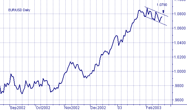 По всей видимости, евро/доллар формирует бычий флаг - сильную и часто встречающуюся модель продолжения тенденции. Формированию этой фигуры предшествует крутая линия графика цен. Модель бычьего флага считается завершенной при решительном прорыве на возрастающих объемах верхней линии тренда, ограничивающей консолидационное движение графика. Если исходить из линейного графика, сегодня эта линия тренда проходит через отметку 1.0790, если же из свечного - 1.0805. Судя по предыдущему восходящему движению, возможными целями могу являться 1.13, 1.18 и 1.20 доллара за евро. Важными сопротивлениями в краткосрочном плане, если модель сработает, станут уровень 1.0935 и 1.1000.