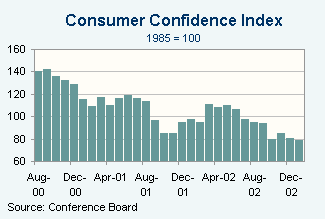 Согласно среднему прогнозу 62 экономистов, опрошенных Bloomberg News потребительское доверие в феврале, рассчитываемое Conference Board, снизится до 77 самой низкой отметки с ноября 1993, против 79 в январе 2003 г. В условиях ожидания войны американцы менее уверены в своем финансовом будущем и предельная норма сбережений растет, в то время как потребительские расходы сокращаются. "Потребители столкнулись с целым списком проблем, - говорит Крис Рупкей, старший экономист в Bank of Tokyo-Mitsubishi Ltd. в Нью-Йорке, не удивительно, что перспектива роста потреблении все еще сомнительна". Новости будут оглашены в 18.00 мск. Conference Board опрашивает 5 000 домашних хозяйств по вопросу текущей занятости и финансовых условий и просит прогнозировать эти условия через 6 месяцев. Если данные выйдут ниже нижней границы прогнозов, курс доллара упадет.