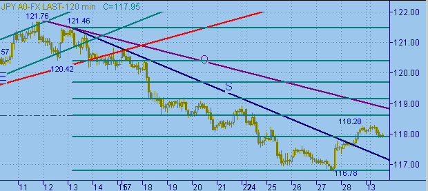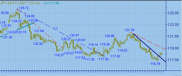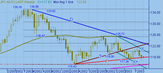 приведены графики с периодами неделя, день, 720мин., 120мин.Существенных изменений не произошло. Текущую ситуацию можем назвать как формирование коррекционного движения от нисходящего тренда 121.46(13/02/03)-116.78(27/02/03) (см. на рис.