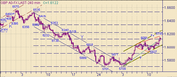 F на рис. 4 соответствует значению цены 1.6022.Торговые тактики. При подходах к уровню 1.6080 (или линии