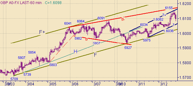 F-F+. Первая ветка в этом канале длиной 382п. (1.5709(3/03/03)-1.6091(7/03/03)). Второе движение в этом канале мы обозначили каналом T-T+ на рис. 4. Вторая ветка с началом от 1.5927(10/03/032) проходит следующим образом: 1.5927-1.6034 длиной 107п; второе поддвижение 1.5975-1.6082 длиной 107п.; третье - 1.6036-1.6155 длиной 119п. Ключевой уровень поддержки связан с ценовым интервалом 1.6062(линия T на рис. 4)-1.6082(ночной максимум). Сам канал F-F+ на рис. 2 и 3 можем определить как границы предполагаемого коррекционного движения от нисходящего тренда 1.6535(5/02/03)-1.5701(25/02/03).В качестве ключевых сигналов рассматриваем: бычий − закрытие часа выше 1.6140: медвежий − закрытие часа ниже 1.6080. Текущее положение линии