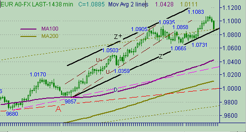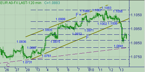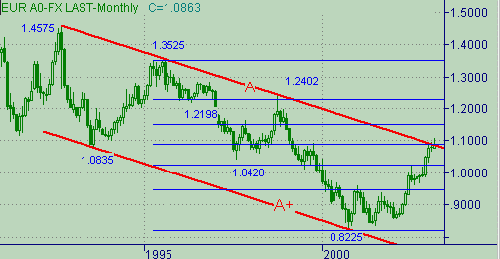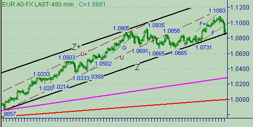 S и E на рис. 4. Текущее положение этих линий соответствуют значениям цен 1.0942 и 1.1028. Важными уровнями ниже текущей цены являются 1.0862 (положение линии X) и сегодняшний минимум, равный 1.0841. Напомним о существовании линии Z на рис. 2, текущее положение которой соответствует цене 1.0859. В связи с важностью текущей ситуации вспомним про линию down-тренда с началом от 1.4575(сент. 1992г.) − линия A на рис. 5. Текущее положение этой линии − 1.0824.Теперь определимся с медвежьими сигналами. Будем считать медвежьими сигналами: закрытие часовой свечи ниже 1.0835, закрытие свечи с периодом 480мин. ниже линии