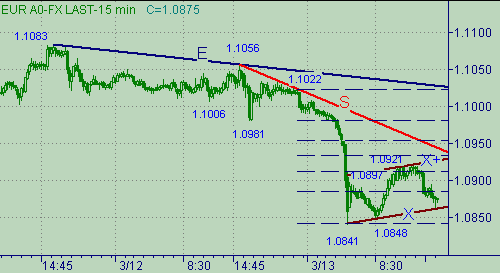 Z-Z+. Утренний минимум, равный 1.0841, всего на 8п. оказался ниже линии Z на рис. 2. Само нисходящее движение от четырехлетнего максимума, равного 1.1083(11/03/03), представлено на рис. 4. Это движение обозначено линией E. В этом тренде присутствуют два поддвижения: первая ветка 1.1083-1.1006 длиной 77п.; вторая ветка началась от 1.1056 и на рис. 4 обозначена линией S. Движение вниз графика с линией тренда линией S проходит следующим образом: первое поддвижение 1.1056-1.0981 длиной 75п.; второе поддвижение 1.1022-1.0841 длиной 81. От второго поддвижения образовался коррекционный канал X-X+ на рис. 4, который состоит из следующих составляющих: первый локальный up-тренд 1.0841 длиной 58п.; второй − 1.0848-1.0921 длиной 73п. Сейчас рынок тестирует линию X на рис. 4.На сегодня важные уровни сопротивления связаны с линиями