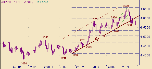 Сегодня рынок тестирует уровень 38.2% коррекции (равен 1.5620) от роста курса 1.4086(март 2002г.)-1.6570(янв. 2003г.) − см. на рис. 1. Это коррекционное движение с началом от 1.6570(31/01/03) на рис. 3 обозначено каналом