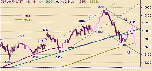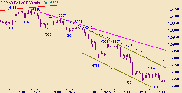 Q-Q+, в котором первая нисходящая ветка 1.6570(31/01/03)-1.5701(25/02/03) имеет длину 869п. Вторая ветка началась от 1.6155(12/03/03) и в случае равенства длин первой и второй веток имеем цель для второй ветки на уровне 1.5286. Текущее положение линии Q+ на рис. 2 соответствует значению цены 1.5476. Нисходящее движение во второй ветки в канале Q-Q+ представлено на рис. 3.Важные уровни сопротивления связаны с положением на рис. 3 линий
