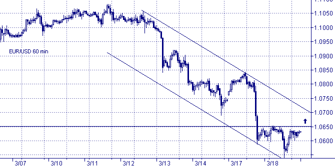 Евро/доллар формирует разворотную фигуру "перевернутая голова и плечи" на часовом графике. Линия шеи проходит через отметку 1.0650. Ее прорыв может привести к росту, как минимум, до верхней границы нисходящего канала на часовом графике, а если проецировать цель, исходя из высоты фигуры, - до 1.0750. При этом уровень 1.0700 является серьезным техническим сопротивлением и его прорыв может вызвать повторное тестирование сопротивления в районе 1.0930. Интересно также отметить тот факт, что долгосрочный восходящий канал, построенный из рассчета цен закрытия, выполнил свою функцию сегодня - цены практически достигли его нижней границы.