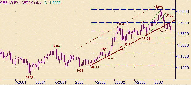 На рис. 1 видим, что сегодня важным парметром будем цена закрытия дня. Вторая фиба, равная 1.5632, от роста курса 1.4086(13/03/02)-1.6570(31/01/03), тестируется недельной свечой.В целом ситуация существенно не изменилась. Из технически важных собитий можем отметить только факт пробития линии