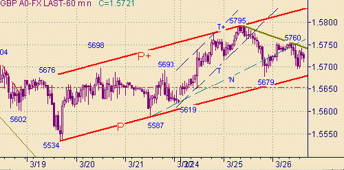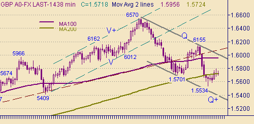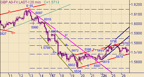MA200 (см. на рис. 1). Границы канала P-P+ на рис. 2 и 3 сохраняются. Вчерашнее опускание курса ниже 1.5700 "спутало карты". Рынок пытался опуститься ниже 1.5700, но максимум, что у него получилось это показать минимум, равный 1.5679. При этом минимальное значение закрытия часовых свечей составило 1.5704. Цель на отработку разворотной фигуры не была достигнута. Но вчерашнее ложное пробитие оставляет надежду на достижение 1.5840. Второе up-движение в канале P-P+ составило длину 208п. (1.5587-1.5795). В случае формирования следующей подобной восходящей ветки будем иметь целевой уровень на 1.5887 (равенство длин двух веток).Совсем близко к текущей цене подтянулась линия