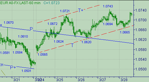 T-T+ (первая ветка 1.0565-1.0721 длиной 156п.; вторая ветка началась от 1.0620); на уровне 1.0790 получается равенство длин двух восходящих поддвижений, составляющих вторую ветку в канале T-T+(первое поддвижение 1.0620-1.0745 длиной 125п.; второе поддвижение началось от 1.0665); на уровне цен 1.0798 имеем цель для отработки разворотной фигуры Двойное Дно с линией шеи линией P на рис. 2; уровень 1.0792 является фибой 50% от нисходящего тренда 1.1083(11/03/03)-1.0501(21/03/03) (см. на рис. 3); дневная MA21 соответствует значению курса 1.0785.В случае достижения целевой области 1.0770-1.0800 быкам необходимо закрепиться выше 1.0840. Закрытие дня выше 1.0840 обозначит нам силу быков и их намерение попытаться подняться к уровню 1.1000.