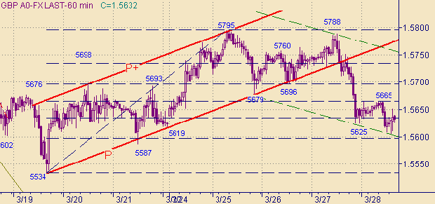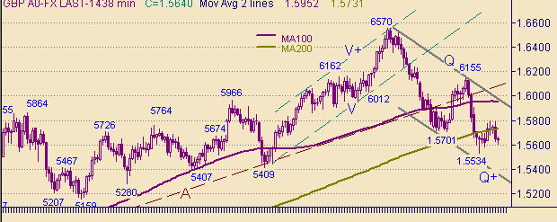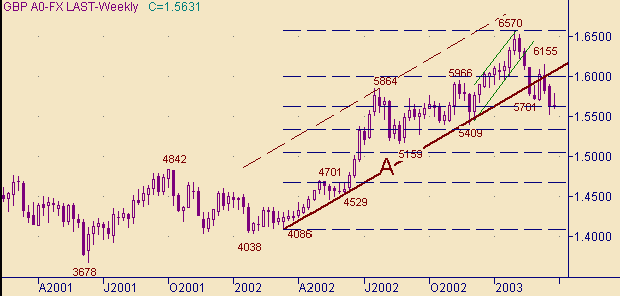 P-P+. Сегодняшний минимум, равный 1.5606, соответствует цели для понижения курса на отработку ширины канала P-P+. Вспомним, что уровень 1.5620 соответствует значению коррекции 38.2% от роста курса 1.4086(март 2002г.)-1.6570(янв. 2003г.) − см. на рис. 1. Сегодняшняя цена закрытия дня будет очень важна для ответа на вопрос: сможет ли недельная свеча закрыться ниже уровня 1.5620. В случае закрытия дня ниже этого уровня ожидаем продолжение нисходящего движения в канале Q-Q+ на рис. 2, с целевыми уровнями 1.5286(равенство длин ветки 1.6570(31/01/03)-1.5701(25/02/03) и ветки с началом от 1.6155(12/03/03) −см. на рис. 2) и 1.5174 (равенство длин нисходящих веток 1.6155(12/03/03)-1.5534(19/03/03) и ветки с началом от 1.5788(25/03/03) − см. на рис. 3).В случае закрепления курса выше 1.5700 у быков появляется шанс для движения в область