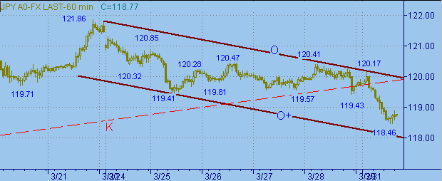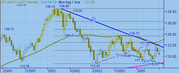 Линия K на рис. 3 пробита. Сейчас формируется коррекция от up-тренда 116.38(10/03/03)-121.86(21/03/03). Это коррекционное движение мы обозначили как канал O-O+ на рис. 4. В этом канале первая ветка 121.86-119.41 составила длину 245п., если считать начало второй ветки 120.41, тогда равенство длин этих нисходящих движений получим на уровне 117.96. Сегодняшний минимум, равный 118.46, соответствует Фибе 61.8% от роста курса 116.38(10/03/03)-121.86(21/03/03) − см. на рис. 3.