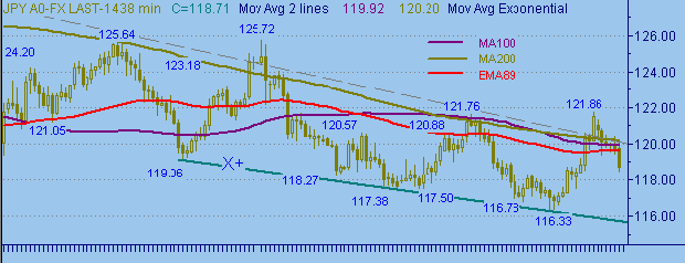 Для движения вниз по графику у пары доллар/йена имеются следующие проблемы: наличие фибы 38.2% от 116.38(10/03/03)-121.86(21/03/03); нахождение осцилляторов в области перепроданности на графиках с периодами час, 15мин. и 5 мин.