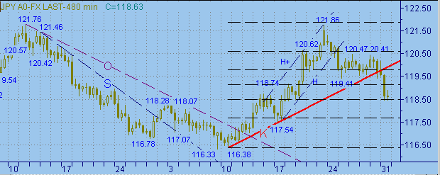 Сейчас формируется коррекция от последней нисходящей ветки на рис. 3 − от ветки 120.17-118.46. Цель этой коррекции: попытаться "поднять" курс до уровня 119.40 с попыткой выхода выше этого значимого уровня; альтернативный вариант - "разгрузить" технические индикаторы и осцилляторы с последующим формированием новой down-ветки с попыткой опуститься ниже 118.46.