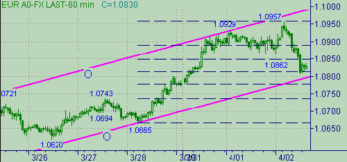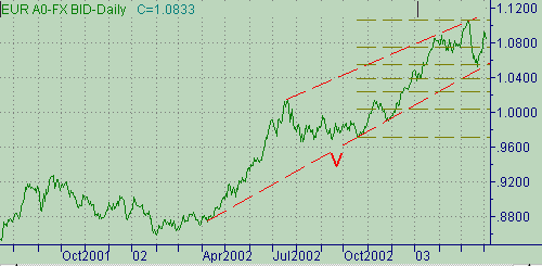 MA05 (текущее положение 1.0816). Сегодняшний максимум, равный 1.0957, "добил" один из целевых уровней, а так же фибу 76.4% (равна значению курса 1.0945) от down-тренда 1.1083(11/03/03)-1.0501(21/03/03) − см. на рис. 2. Таким образом, мы пока не имеем явных технических сигналов, которые подтверждали бы начало down-тренда. Повторим то, что писали вчера. Что бы обозначить возможное начало down-тренда евро/доллару необходимо сначала закрыть дневную свечу ниже дневного MA05, а потом закрыть день ниже дневного MA14 (текущее значение 1.0697). Другими медвежьими сигналами можно считать закрытие часа ниже линии O на рис. 2 и 3. Текущее положение линии O соответствует значению курса 1.0794. Опускание курса ниже этой линии будет означать окончание up-тренда с началом от 1.0501(21/03/03) (см. на рис. 3.), а само это восходящее движение будет являться частью коррекции от роста курса 0.9857(2/12/02)-1.1083(11/03/03). В случае формирования в канале O-O+ третьей восходящей ветки, у этого канала появляются шансы стать первой волной в новом восходящем движении вдоль линии V на рис. 4.Сейчас формируется коррекционное движение от роста курса 1.0665(28/03/03)-1.0957(2/04/03), который является второй восходящей веткой в канале
