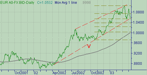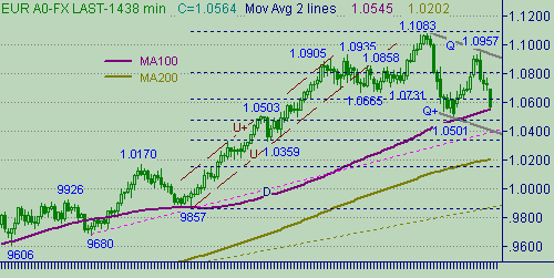 down-движение от роста курса 0.9857(2/12/02)-1.1083(11/03/03) на рис. 2 обозначили каналом Q-Q+. Текущее положение линии Q+ соответствует значению курса 1.0399. Напомним, что равенство длин down-веток в канале Q-Q+ соответствует значению курса 1.0494. Равенство длин веток в канале Z-Z+ получается при значении курса 1.0463: первая ветка 1.0957-1.0684 длиной 273п., вторая ветка началась от 1.0736. Нисходящее движение с началом от 1.0763 составляет 178п. Сегодняшний минимум равен 1.0558. Это почти соответствует текущему положение линии V на рис. 1 (положение линии V − уровень 1.0552), проведенную по ценам закрытия дня. Здесь же рядом находится дневной MA100 (текущее положение 1.0546). Сейчас формируется коррекция от снижения курса 1.0736-1.0558. Ключевой уровень сопротивления связан с положением линии Z на рис. 4. Текущее положение линии Z соответствует значению курса 1.0692.Торговые тактики. При подходе к 1.0640 открывать позиции на продажу, стоп-лосс располагать выше линии