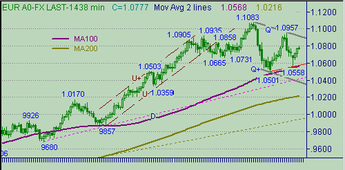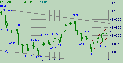 T-T+) так и линией-образующим уровнем, т.к. через него сегодня проходит линия Q на рис. 1. Тестирование этого уровня с последующим снижением курса евро/доллар обозначит нам модель коррекционного движения с началом от 1.1083(11/03/03) как модель треугольника, нижняя сторона которого почти совпадает с дневным MA100 − см. на рис.1. Важный уровень ниже текущей цены связываем с линий T на рис. 3. Опускание курса ниже этой линии откладывает тестирование линии Q на рис. 1 и заставит нас искать новые варианты на постановку покупок с целью до 1.0900.Торговые тактики. Продолжать держать покупки от 1.0680, стоп-лосс располагать ниже линии