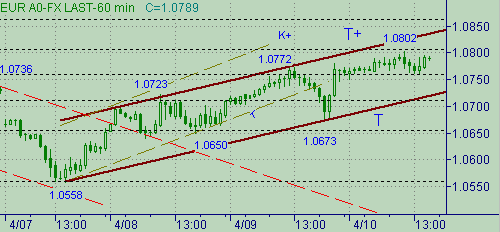 T-T+. Первая ветка в этом канале 1.0558(7/04/03)-1.0772(9/04/03) составила длину 214п. Вторая ветка началась от вчерашнего минимума, равного 1.0673. Сегодняшний максимум, равный 1.0802, отмерил длину второй ветки равной длине первой умноженной на коэффициент 0.618. Вспомним так же, что фиба 61.8% от снижения курса 1.0957(2/04/03)-1.0558(7/04/03) соответствует значению цены 1.0804. Целевой уровень в случае равенства длин восходящих веток в канале T-T+ находится на 1.0887.Ключевой уровень сопротивления находится на 1.0900, который является как целевым уровнем (например, в канале