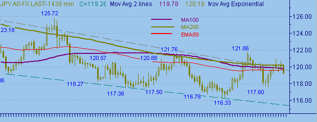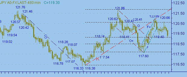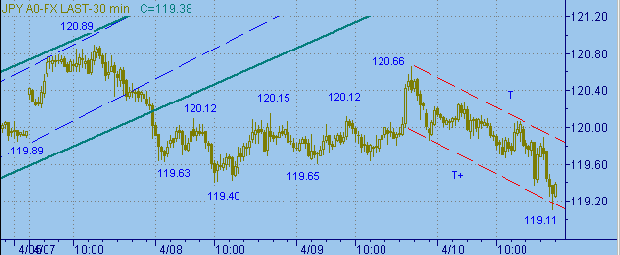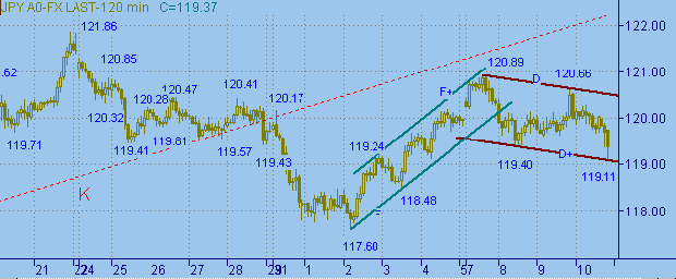 D-D+ на рис. 3 и канал T-T+ на рис. 4). В канале D-D+ движение проходит: 120.89-119.40 длиной 149п. и 120.66-119.11 длиной 155п. Сейчас ожидаем движение на рост доллар до линии T на рис. 4.Торговые тактики. В случае выхода выше 119.40 рассматривать постановку позиции на покупку с целью 120.40, стоп-лосс 118.99, при достижении ценой линии