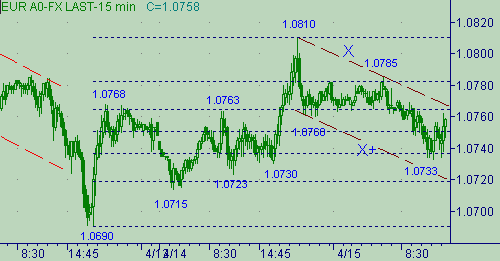 R-R+. Движение в этом канале проходит: первая ветка 1.0829(10/04/03)-1.0690(11/04/03) длиной 139п.; вторая ветка началась от 1.0810 и в случае равенства длин нисходящих веток имеем цель для второй ветки на уровня 1.0671. Вторую ветку с началом от 1.0810 на рис. 4 обозначили каналом X-X+. В этом канале сформировалось так же две ветки: 1.0810-1.0760 длиной 50п.; 1.0785-1.0735 длиной 52п. Сейчас рынок тестирует линию X на рис. 4. Текущее положение этой линии (значение курса 1.0767) совпадает с сильным уровнем. В случае, если от этого уровня сопротивления будет сформирована третья нисходящая ветка в канале X-X+, в качестве цели для неё будем ожидать значение курса 1.0717. Уровень 1.0718 соответствует фибе 76.4% от роста курса 1.0690(11/04/03)-1.0810(14/04/03).На сегодня важными уровнями являются 1.0730, 1.0717 и 1.0670. . В то время пока курс находится выше уровня 1.0730 можно предполагать, что вчерашний рост курса 1.0730-1.0810 являтся первой импульсной волной на рост евро. Опускание курса ниже 1.0717 обозначит нам удлинение третьей нисходящей ветки в канале