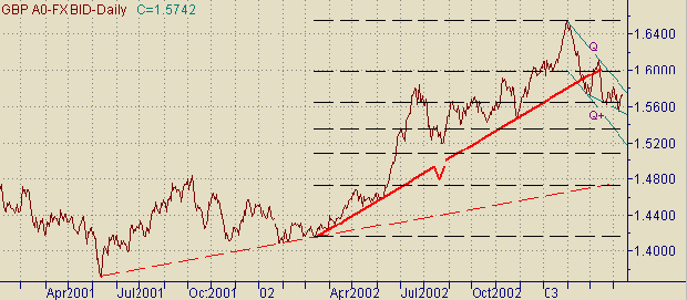 Ситуация не изменилась. Продолжается коррекция от роста курса 1.5498(9/04/03)-1.5739(14/04/03). Формируется вторая коррекционная ветка с началом от 1.5766 − канал