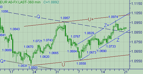 H на рис. 3. Двухдневное изменение курса в коридоре 40п. привело к тому, что линия Z (линия up-тренда с началом от 1.0558(7/04/03)) подтянулась до значения 1.0854.На сегодня ключевым техническим уровнем является интервал цен 1.0820-1.0830. Этот уровень может стать опорой для быков и поэтому на нем можно пробовать открывать покупки. В случае закрытия часа ниже 1.0825 или опускания курса ниже 1.0795 предпочтительнее будут выглядеть продажи