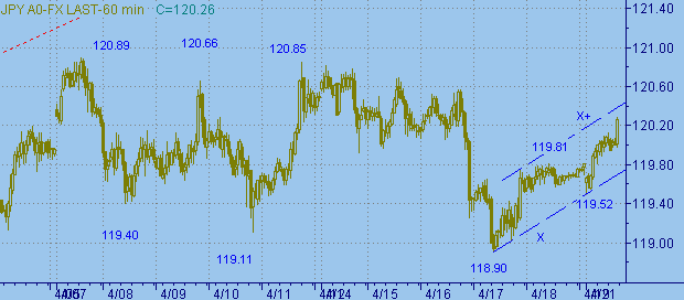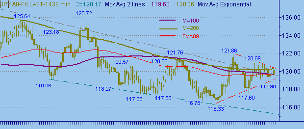 X+ на рис. 3 соответствует значению цены 120.38; равенство up-веток в канале X-X+ находится на уровне 120.43; текущее положение верхней стороны в треугольнике на рис. 2 соответствует значению цены 120.44.Торговые тактики. В случае подхода курса к уровню 120.70 искать подтверждения постановки продаж на вспомогательных индикативных функциях (нахождение в области перекупленности) и в случае подтверждения открывать продажи, стоп-лосс 121.30, цель 119.00.