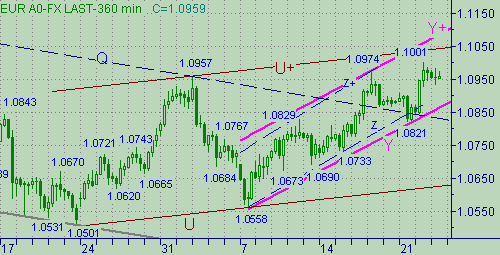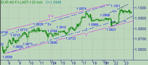 O на рис. 3 и 4, т.к. от линии O вполне вероятно up-движение с целью до 1.1080. В результате такого роста евро ожидаем "дозревание" индикативных функций до области перекупленности на графиках час и 240мин. Пока на этих графиках есть небольшая потенция для движения индикаторов наверх. В этом основная проблема (слабое место) позиций на продажу. Поэтому вчерашний стоп-лосс для продаж мы поставили выше 1.1080.В канале