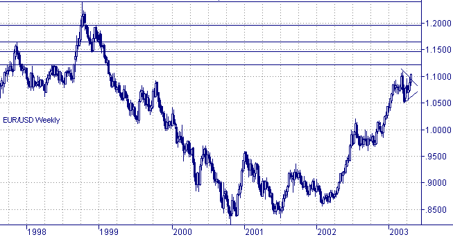 Доллар вернулся к своим минимумам в последние часы европейских торгов и продолжает торговаться здесь в настоящее время. Аналитики, опрошенные AFX, приписывают слабость американской валюты падению американских акций, продолжающемуся второй день подряд. "Доллар скорее следует за акциями, нежели за экономическими новостями", - говорит Джулиан Джессоп, аналитик из компании Standard Chartered. Другие аналитики взяли на вооружение проблему Северной Кореи, которая официально признала наличие у нее ядерного оружия. Слабости йены приписали стремительно распространяющейся в регионе атипичной пневмонии. Правда, йена оправилась после того, как доллар начал падать против других валют. У дилеров же своя точка зрения на произошедшее падение доллара. Они приписали часть убытков доллара неподтвержденным сообщениям о взрыве на электростанции в Калифорнии. Однако NBC сообщила о том, что подача энергии восстановлена. Несмотря на то, что же действительно явилось фундаментальной подоплекой возобновившегося приступа слабости американской валюты, техническая картина, кажется, улыбается евро, если, правда, недельная свеча закроется выше психологической отметки в $1.10, психология толпы окажет свое воздействие: игроки начнут покупать то, что скупают все. Если признаки тренда очевидны, его развитие может принять неуправляемый характер. Именно тогда на сцене и появляется регулирующий орган в лице Центробанка, который валютными интервенциями устраняет панику на рынке. В марте, когда евро достигал своих новых многолетних максимумов против доллара, офера ЕЦБ стояли на $1.12