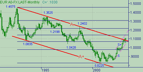 A-A+ (1.4575(сент. 1992г.)-1.8225(окт. 2000г.)). Третий месяц рынок находится между Фибами 38.2% и 50%, равными соответственно 1.0651 и 1.1400.Сильным медвежьим сигналом будем считать закрытие дня ниже 1.0980 или закрытие часа ниже линии