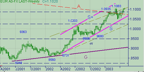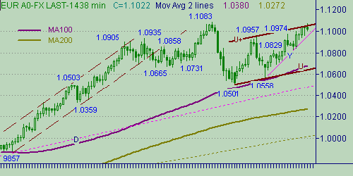 Отметим значение цены закрытия последней недели, которая равна 1.1035. Это составляет абсолютное значение максимума цен закрытия недели с марта 1999г.