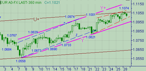 Y на рис. 4. Текущее положение линии Y на рис. 4 соответствует значению курса равного 1.0940. Торговые тактики. В связи с тем, что пока подтверждающих сигналов начала нового медвежьего тренда рынок не сформировал, то трейдерам использующим не рисковые тактики советуем закрывать позиции на продажу при подходе курса к 1.1000. Агрессивным трейдерам можно продолжать держать продажи, стоп-лосс 1.1105. В случае закрытия дня ниже 1.0980 рассматривать возможности постановки позиций на продажу. Долгосрочная цель для продаж 1.0570, краткосрочная − 1.0820. Для любителей работать по направлению основного тренда можем предложить рассмотреть возможности открытия позиций на покупку при подходе курса к 1.0980 и подтверждающих сигналах вспомогательных индикативных функциях на графиках с периодами 15мин. и 5мин. , стоп-лосс располагать ниже линии Y на рис. 4, цель 1.1130.Поддержка: 1.0980, 1.10940, 1.0920, 1.0890, 1.0820, 1.0770, 1.0730, 1.0670, 1.0640, 1.0600, 1.0565, 1.0500, 1.0465.
