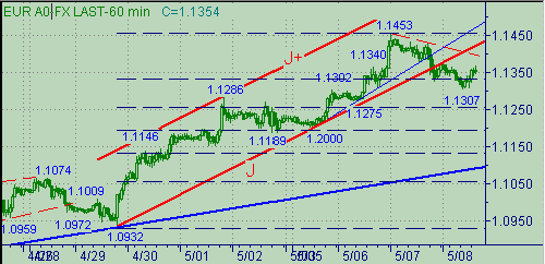 up-тренда в down-тренд. В случае закрытия дня ниже 1.1280 ожидаем продолжения нисходящего коррекционного движения с началом от 1.1453(5/05/03) до области цен 1.1035.В текущей ситуации технический перевес на стороне быков: уровни 1.1360 и 1.1280 устояли, на часовом графике сегодня почти все вспомогательные индикативные функции "отметили" свои сильные уровни поддержки. На стороне медведей: пробитие ценой линии