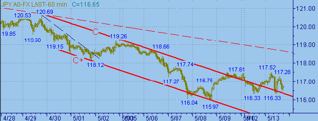 C-C+ на рис. 3. Целью этого движения является "разгрузка" вспомогательных индикативных функций попавших на фоне нисходящего тренда в зону перепроданности. Воспользовавшись этим тайм-айтом доллар/йена пытаются осмыслить свой подход к важному уровню 116.30, который является текущим положением линии Up-тренда с началом от 79.78(апр. 1995г.). Проскочить ниже этого приметного курсового значения на фоне "перепроданности" рынок не смог. Текущая восходящая коррекция с началом от 115.97(8/05/03) не смогла сформировать сильный бычий сигнал, а именно закрыть дневную свечу выше 117.35. Поэтому у медведей есть хорошие перспективы в случае изменения курса в коридоре 116.00-117.00 разгрузить индикаторы и сформировать новую попытку преодолеть 116.30 (закрыть день ниже этой цены).Торговые тактики. Вне рынка. Ситуацию рассматриваем как нейтральную. В случае роста курса до 118.00-118.40 рассматривать возможности постановки позиций на продажу при подтверждающих сигналах вспомогательных индикативных функций.