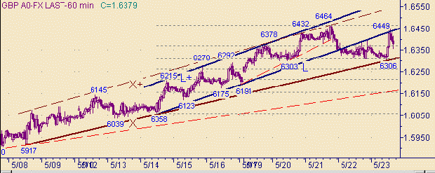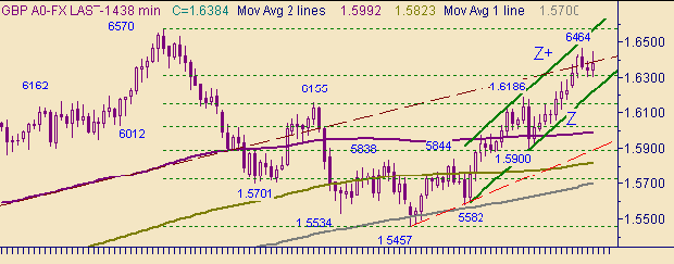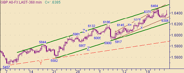 X продолжается. Сегодняшний минимум, равный 1.6306, протестировал линию X на рис. 3. А сегодняшний максимум, равный 1.6449, протестировал сверху линию L. Ключевая поддержка остается на 1.6300. Закрытие дня ниже этого уровня будем расценивать как сильный медвежий сигнал. В случае опускания курса ниже 1.6300 ключевой уровень поддержки будем связывать с положением линии Z на рис. 2. Текущее положение линии Z соответствует значению курса 1.6211.Торговые тактики. В случае опускания курса до 1.6315 открывать покупки, цель 1.6500. Стоп-лосс опускать ниже 1.6250. В случае опускания курса до 1.6250 открывать покупки, стоп-лосс располагать ниже линии