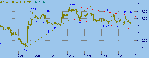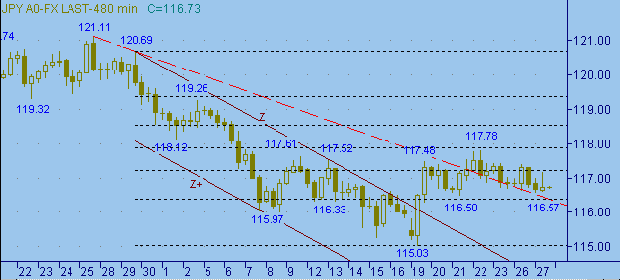 Вчерашний день не смог закрыться ниже 116.60. Ситуация не изменилась. Нисходящее четырехдневное движение с началом от 117.78(22/05/03) продолжается − см. на рис. 3. Линия канала для этого движения находится на уровень 116.25.