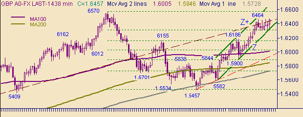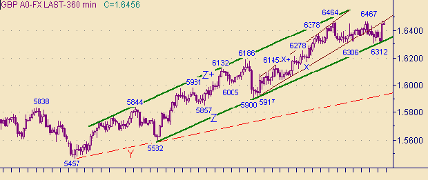 Сейчас рынок пытается выйти из коридора 1.6300-1.6467 через верхнюю границу. На сегодня ключевые уровни: сопротивления − 1.6467 и 1.6570; поддержки − 1.6390 и 1.6300. На рис. 2 видим, ч то сегодня днем рынок протестировал линию Z. Если рынок сможет закрепиться выше 1.6467, тогда новое восходящее движение будем рассматривать как третью up-ветку в канале Z-Z+ с целью до области 1.6850-1.6900.Торговые тактики. В случае выхода выше 1.6500 и последующего тестирования этого уровня сверху открывать позиции на покупку, стоп-лосс − ниже 1.6460, цель 1.6800. Промежуточные целевые уровни для переноса стоп-ордеров вверх по графику − 1.6570, 1.6640, 1.6720.