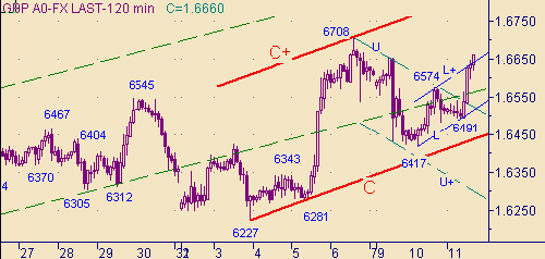 C-C+ продолжается. Новую локальную восходящую ветку обозначили на рис. 3 каналом L-L+. Сейчас рынок пытается закрепиться выше уровня 1.6648, который является уровнем равенства длин восходящих движений в канале L-L+. Есть надежда на то, что канал L-L+ станет импульсным. Но, в следствии отсутствия касания минимальной ценой вчерашнего дня линии C на рис. 2 канал L-L+ может быть трехволновым.На сегодня ключевые уровни: поддержка − 1.6410, сопротивление − 1.6730. Выход цены выше 1.6730 увеличит шансы канала