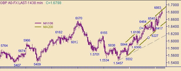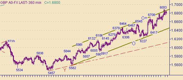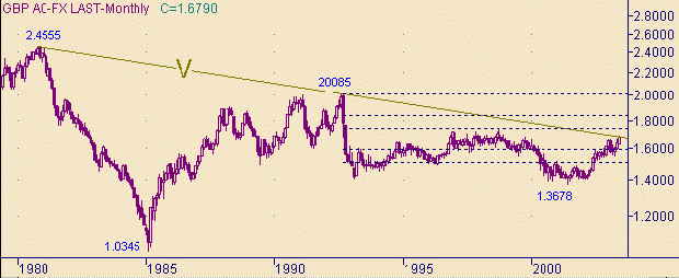 V, которая является линией сопротивления с октября 1980г.На рис. 3 и 4 видим, что все восходящие каналы сохранились. Движение в канале O-O+ на рис. 2 и 3 проходит: первая ветка 1.5582(21/04/03)-1.6186(6/05/03) длиной 604п.; вторая − 1.5900(7/05/03)-1.65345(29/05/03) длиной 645п.; третья ветка началась от 1.6227(3/06/03) и в случае равенства длин второй и третьей веток имеем цель для последней на уровне 1.6872.