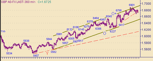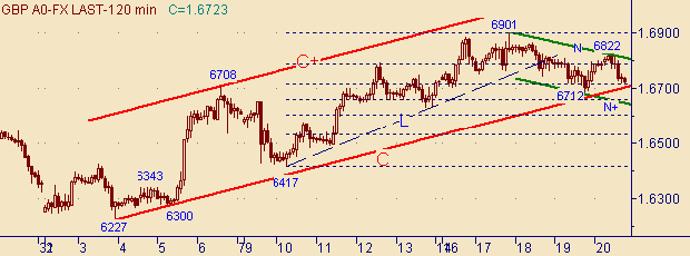 C-C+ на рис. 3 сохранился. Текущее положение линии C соответствует значению курса 1.6693. В случае закрытия часа ниже 1.6680 будем считать линию С пробитой. Рассматривая нисходящий локальный канал N-N+ на рис. 3 отметим, что равенство длин веток в этом канале находится на уровне 1.6601. Другим сильным медвежьим сигналом будем считать закрытие дня ниже 1.6720.Торговые тактики. Предпочтительнее позиции на продажу, но в текущей ситуации открывать продажи не удобно. Позиция − вне рынка.