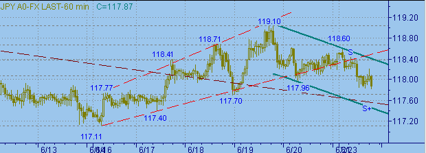 S-S+ с началом от 119.10, целевой уровень сегодня находится на уровне 117.45: текущее положение линии S+, а так же равенство длин нисходящих веток в канале S-S+. Текущее положение линии S соответствует ценовому уровню 118.41, который и будет на сегодня важным уровнем сопротивления. На пути к 117.45 сильным уровнем поддержки является ценовое значение 117.70.Торговые тактики. В случае подхода к 118.10 открывать продажи, стоп-лосс − выше 118.40, цель - 117.45.