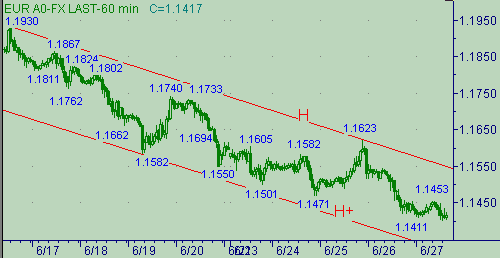 H-H+ на рис. 2 и 3. Вторая ветка в этом движении началась от 1.1623. Эта ветка формируется слудеющим образом: первое нисходящее движение составило 212п. (1.1623-1.1411). После чего сегодня сформировался подъем до 1.1453 и сейчас рынок тестирует уровень 1.1402, который, как отмечают многие трейдеры, является примечательным уровнем. Например, уровень 1.1405 соответствует значению уровню Фибоначчи 38.2% от роста курса 1.0558(7/04/03)-1.1931(27/05/03). Сделаем первую "прикидку" для перспектив down-движения с началом от 1.1623: если сегодняшний локальный максимум, рапвный 1.1423, сохранится и курс евро/доллар опустится ниже 1.1400, то равенство длин нисходящих веток получается на уровне 1.1341 (1.1623-1.1411 и 1.1453-1.1341), что почти соответствует целевому уровню для отработки Двойной вершины с максимумом на 1.1930 и линией шеи на 1.1620. В случа5е выхода курса выше 1.1453 будем считать сегодняшнее снижение курса до 1.1402 как составную часть коррекции от 1.1623-1.1411 с целью достижения целевого уровня 1.1400.Текущее положение линии