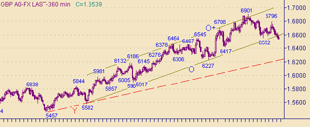 O-O+, проведенный по ценам закрытия дня. Сегодня это пытается сделать дневная свеча с подобным каналом на рис. 2. Сейчас фунт/доллар мы застали за увлекательным занятием − формирование второй ни сходящей ветки в канале H-H+ на рис. 3. Равенство длин веток в этом канале имеем на уровне 1.6447. Если рассматривать структуру второй ветки (с началом от 1.6796), то в этой формации равенство длин имеем на уровне 1.6403. . Сегодняшний минимум соответствует значению 1.6502.На сегодня ключевое сопротивление рассматриваем на 1.6665. Ключевая поддержка − 1.6415.