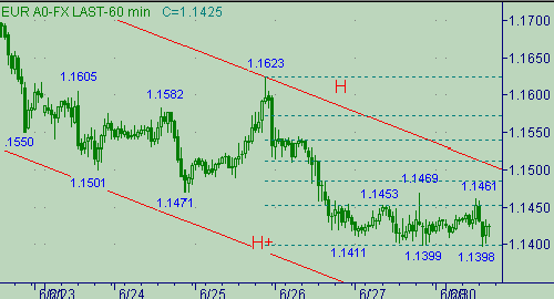H на рис. 3 соответствует значению курса 1.1507. Если рассматривать максимум прошлой недели, равный 1.1623, как начало второй нисходящей ветки в канале H-H+, то уровень 1.1394 соответствует случаю, когда вторая ветка имеет длину 50% от первой (1.1930-1.1771 − см. на рис. 2). Напомним, что быки сейчас обороняют важный технический рубеж перед отработкой Двойной вершины с целью на уровне 1.1300. На пути от 1.1400 до 1.1330 могут возникнуть проблемы на уровне 1.1364, являющимся абсолютным минимумом с 9/05/03.На сегодня важная область сопротивления 1.1470-1.1500.