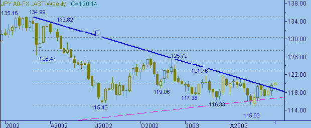 D на рис. 1. Текущая неделя будет пробовать закрыться выше уровня коррекции 23.6% (равен 119.75) от снижения курса 134.99(27/02/02)-115.03(19/05/03) − см. на рис. 1. Текущее положение линии H+ на рис. 3 соответствует значению курса 131.40. Равенство длин восходящих веток в канале H-H+ находится на 121.90.На сегодня важная поддержка находится на 119.65.