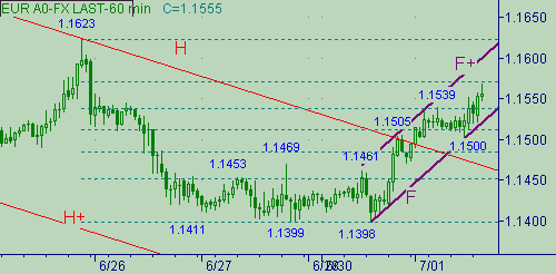 Вчерашний день закрылся выше линии H на рис. 2. Новое восходящее локальное движение обозначили на рис. 3 каналом F-F+. Текущее положение линии F на рис. 3 соответствует значению курса 1.1520. Равенство длин веток в канале F-F+ на рис. 3 находится на 1.1640.На сегодня ключевой областью сопротивления является уровень 1.1625. При подходе к этому уровню ожидаем техническое сопротивление на интервале 1.1570-1.1585. В случае выхода курса выше 1.1625 ожидаем дальнейшее движение к 1.1752. А в случае закрытия дня выше 1.1680 у