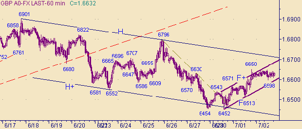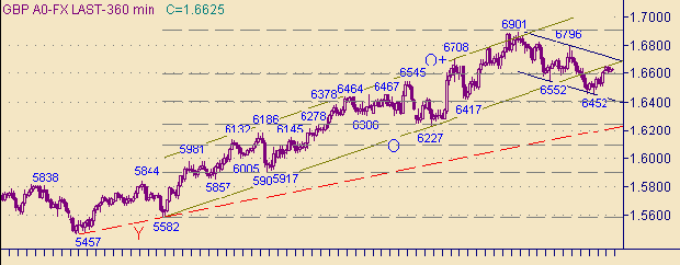 Продолжается восходящий тренд вдоль линии F на рис. 3 и 4. Вчерашним максимумом рынок протестировал линию O на рис. 2. На сегодня ключевой уровень поддержки − уровень 1.6600.Торговые тактики. Планы не изменились. Позиции на продажу держим, стоп-лосс − ниже 1.6600, цель − 1.6700. В случае закрытия часа ниже 1.6600 рассматриваем возможности постановки продаж с целью до 1.6460.