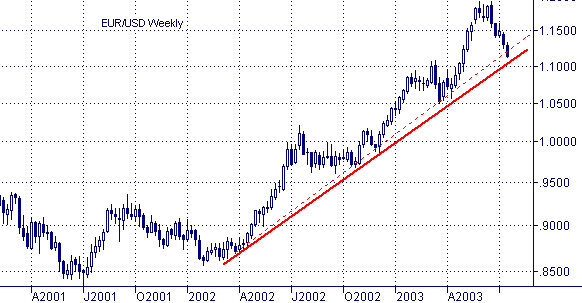 Институциональные инвесторы продолжают расставаться с лонгами в единой европейской валюте. В первые неделе июля продажи со стороны этих участников были самыми большими в этом году. Число чистых евролонгов на IMM на неделе, закончившейся 8-ого июля, упало к трехмесячному минимуму. На этом фоне, технические перспективы европейской валюты выглядят еще более пугающими. На недельном графике курс сформировал разворотную фигуру "шип", которая характеризуется стремительностью обратного движения цен. Уже многие серьезные уровни поддержки оставлены позади, однако решающим из них следует признать линию восходящего тренда, которая пока что еще не пробита. В противном случае можно будет окончательно говорить о смене восходящей тенденции на нисходящую. Пунктирной линией обозначена линия тренда по уровням закрытия недельных сессий (теория Доу), сплошной − линия тренда по уровням минимумов цен. Считается, что необходим прорыв одной свечи на 3 %, либо закрытие двух свечей подряд при отсутствии данного условия, чтобы можно было говорить о прорыве линии поддержки. Закономерно ожидать покупок в данном районе, что исключает пробития "с ходу". Поэтому пока рекомендуется закрыть короткие позиции и наблюдать за развитием событий. Более рисковым игрокам можно попробовать открыть лонг в районе $1.1050. В случае прорыва линии долгосрочного восходящего тренда целями движения станут уровни в районе 1.0500, 1.0200, 1.0000.