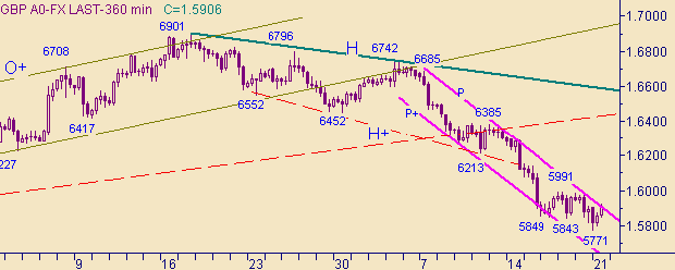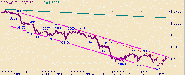 P-P+ на рис. 2. Сейчас рынок пытается пробиться выше линии P. Текущее положение линии P на рис. 3 соответствует значение курса 1.5939. Сегодняшнее противоборство быков и медведей можно так назвать: сумеют ли медведи закрыть день ниже 1.5795 или сумеют ли быки закрепиться выше линии P на рис.2.Торговые тактики. Для открытых продаж стоп-лосс определять по закрытию часа выше линии