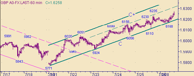 C-C+ на рис. 3. Сегодня днем фунт/доллар протестировали линию C. Движение в канале C-C+ проходит следующим образом: первая ветка − 1.5771(21/07/03)-1.6051(22/07/03) длиной 280п.; вторая ветка − 1.5924(23/07/03)-1.6200(25/07/03) длиной 276п.; третья ветка началась от 1.6110(28/07/03) и в случае равенства её длины 280п. имеем цель на уровне 1.6390. Текущее положение линии C на рис. 3 соответствует значению курса 1.6190.Сегодня рынок может сформировать сильный бычий сигнал − закрыть день выше 1.6230.
